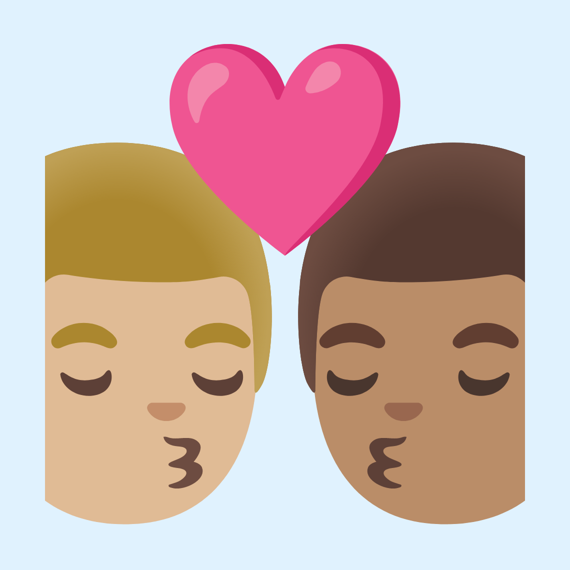 Kiss: man, man, medium-light skin tone, medium skin tone emoji π¨πΌββ€οΈβπβπ¨π½ is part of the People & Body and Family emojis. On some systems it can be accessed by using :kiss_man_man_tone2-3:, :kiss_mm_tone2-3:, :kiss_man_man_tone2_tone3: or :kiss_man_man_medium_light_skin_tone_medium_skin_tone: shortcodes.